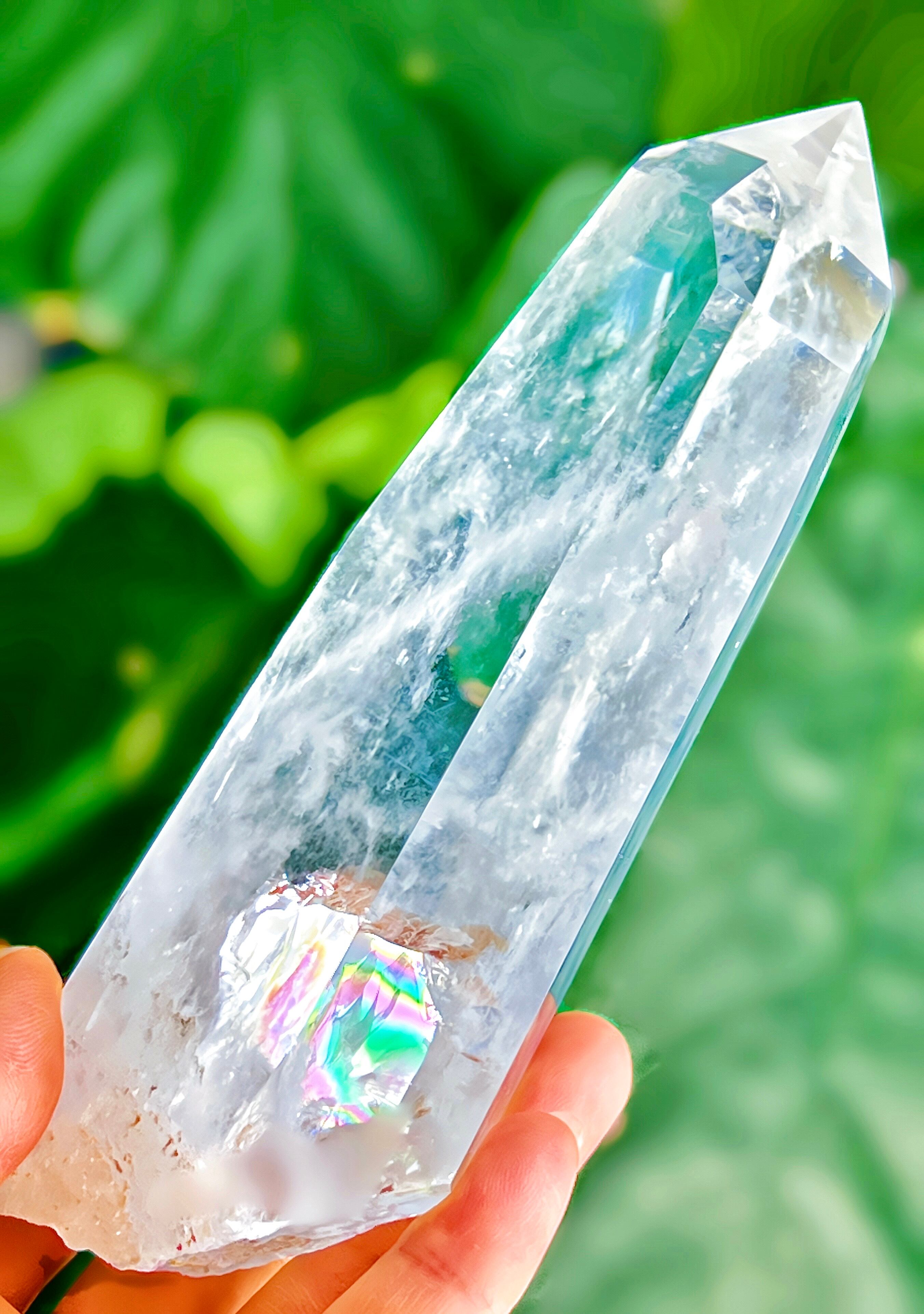 光が当たると、透明度の高いクリアクォーツの内部に、