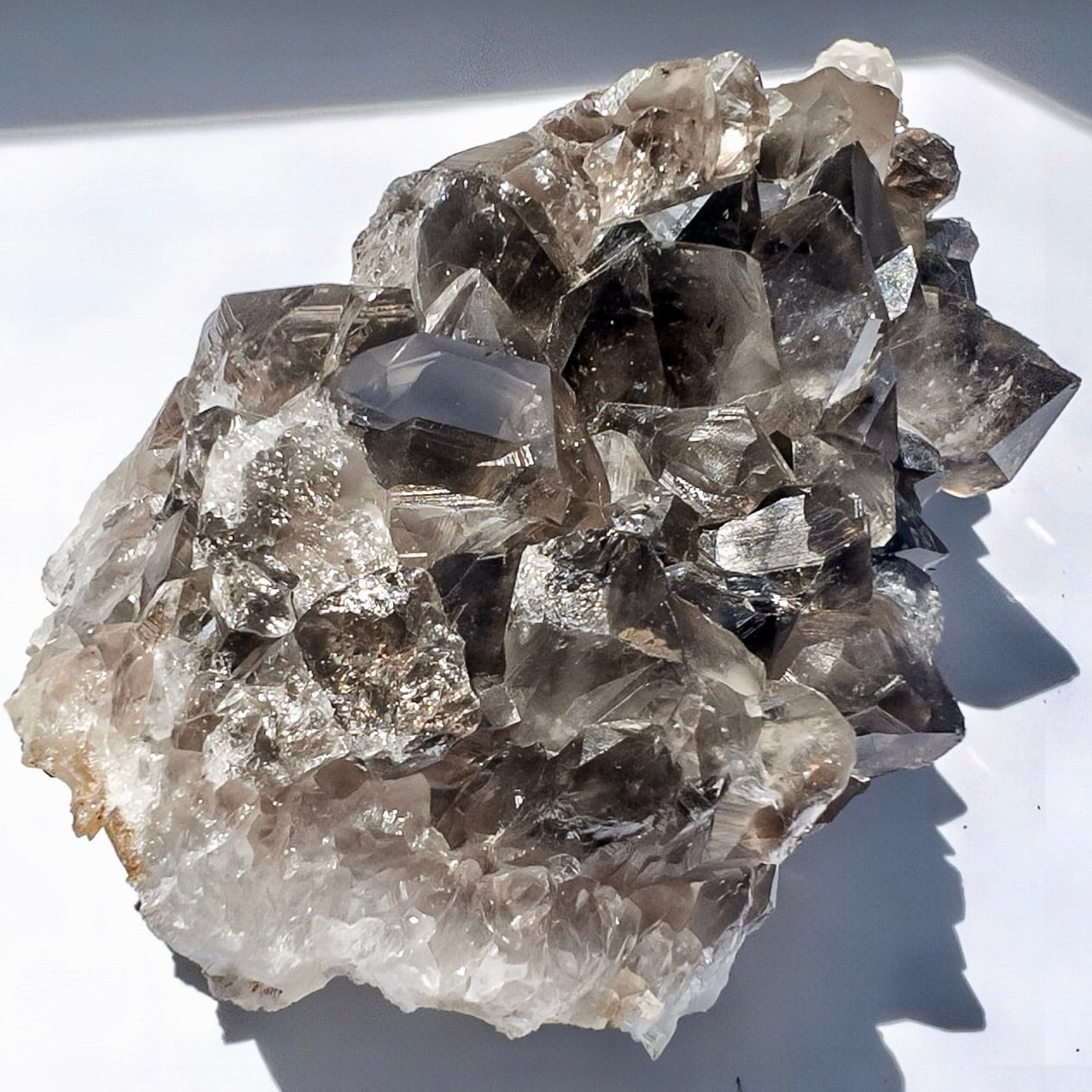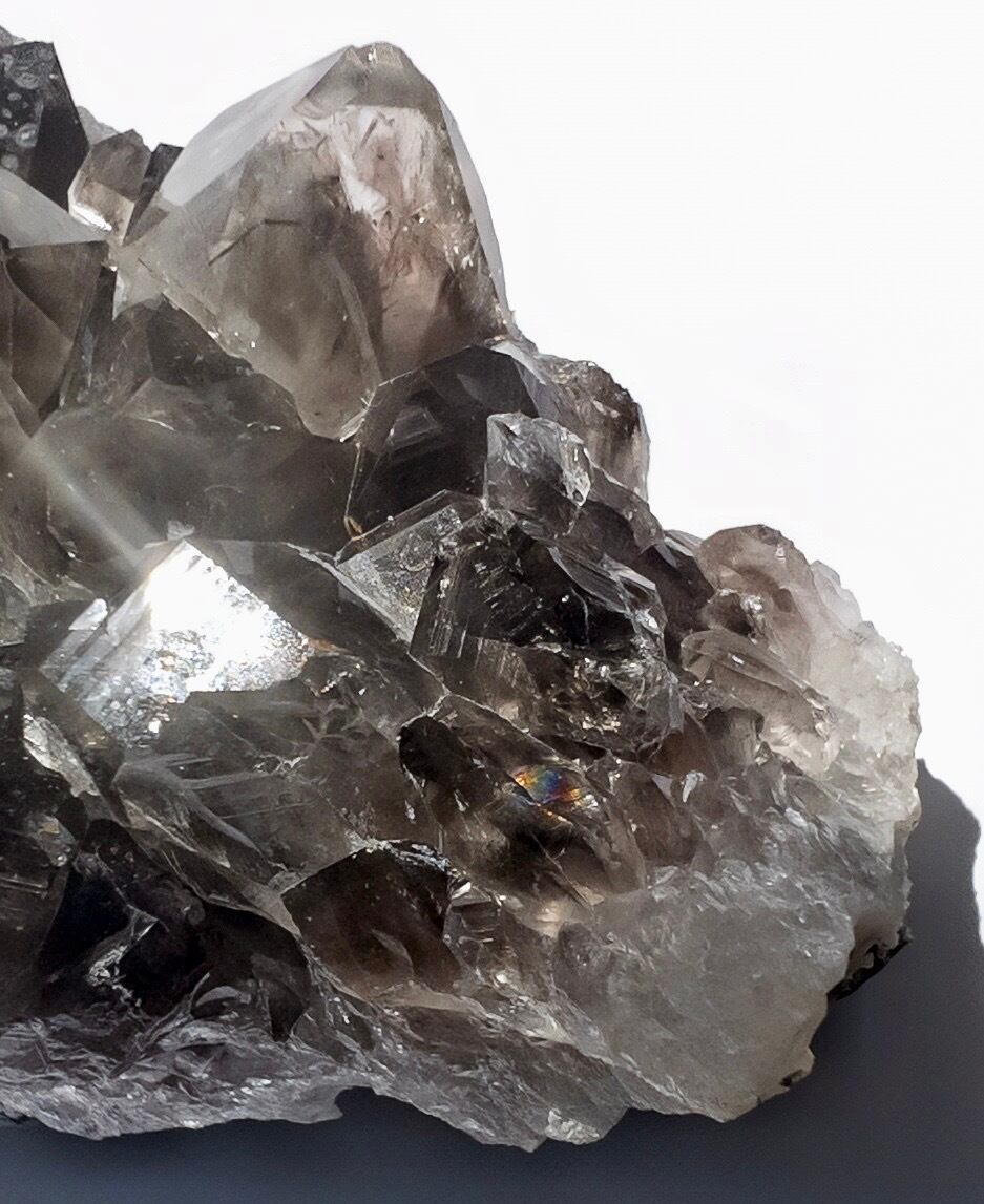 高密度で透明感のある黒褐色の結晶群が光を受けると、内側から星屑のような微細な輝きが浮かびあがります。