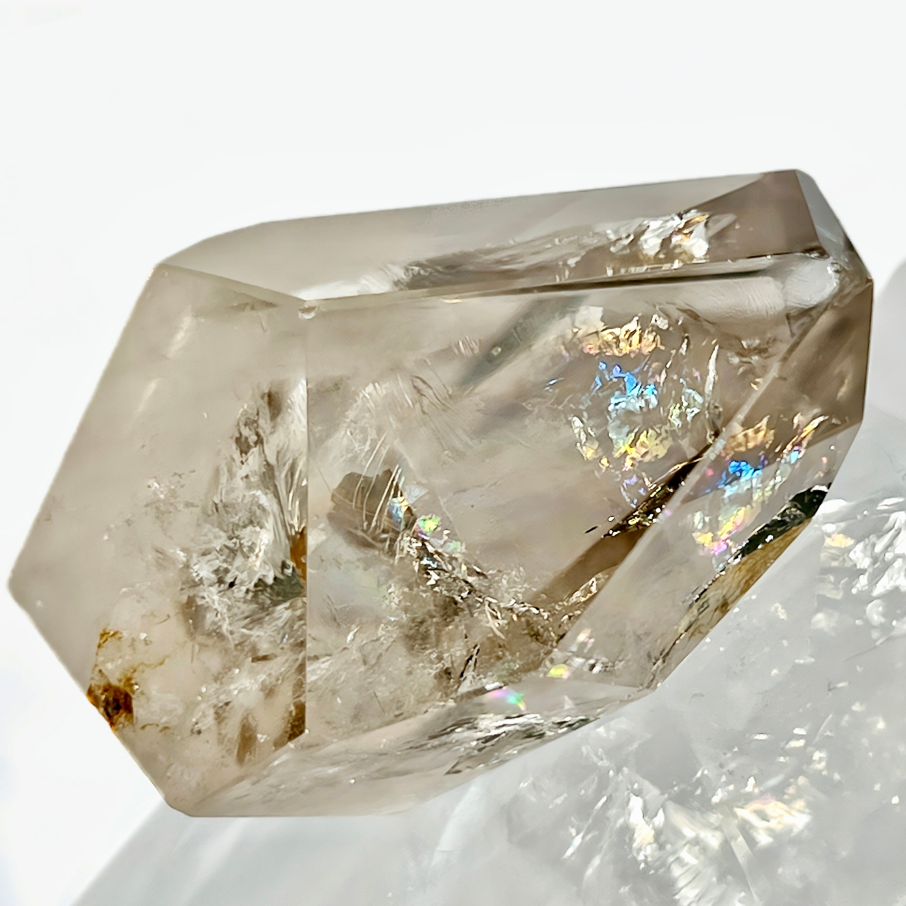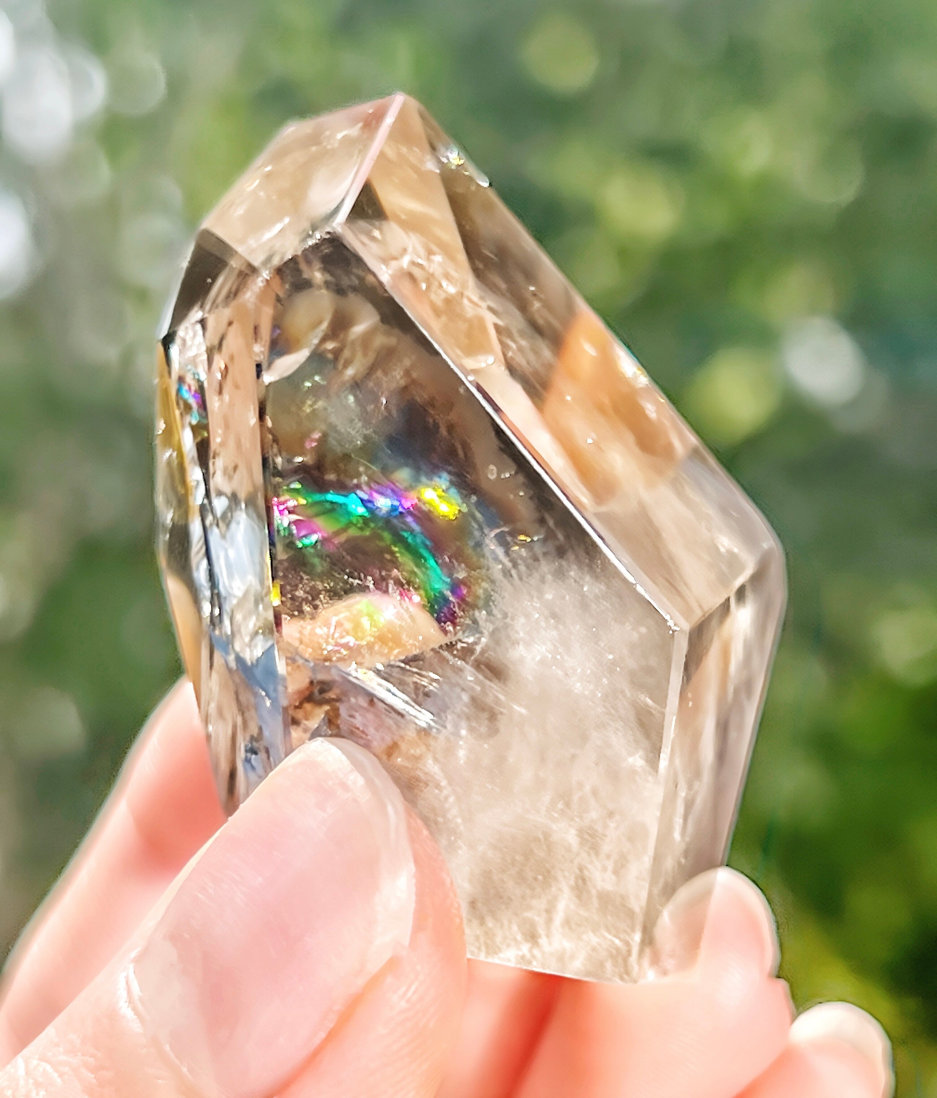 結晶内のクラックやインクルージョンに光が差すことで現れる「アイリス=虹」は、困難を乗り越えた後に現れる祝福や変容の象徴とされています。