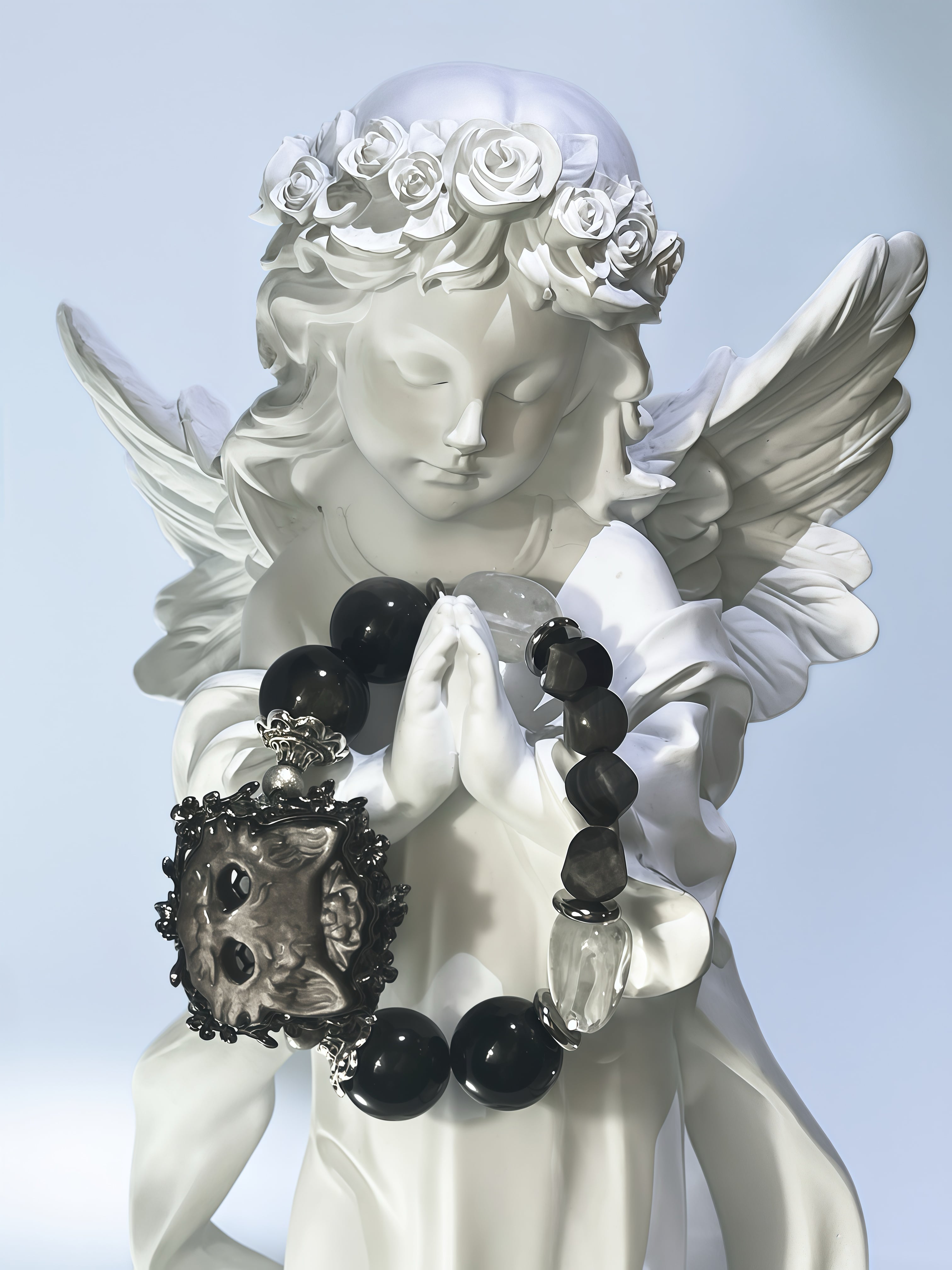 ・使用天然石:プラチナオブシディアン狐カービング(約37.4×34.8×16.4mm)、プラチナオブシディアン(約15.8mm)、水晶ナゲット(約17.0mm)、アイスオブシディアンカットビーズ(約9.0mm)