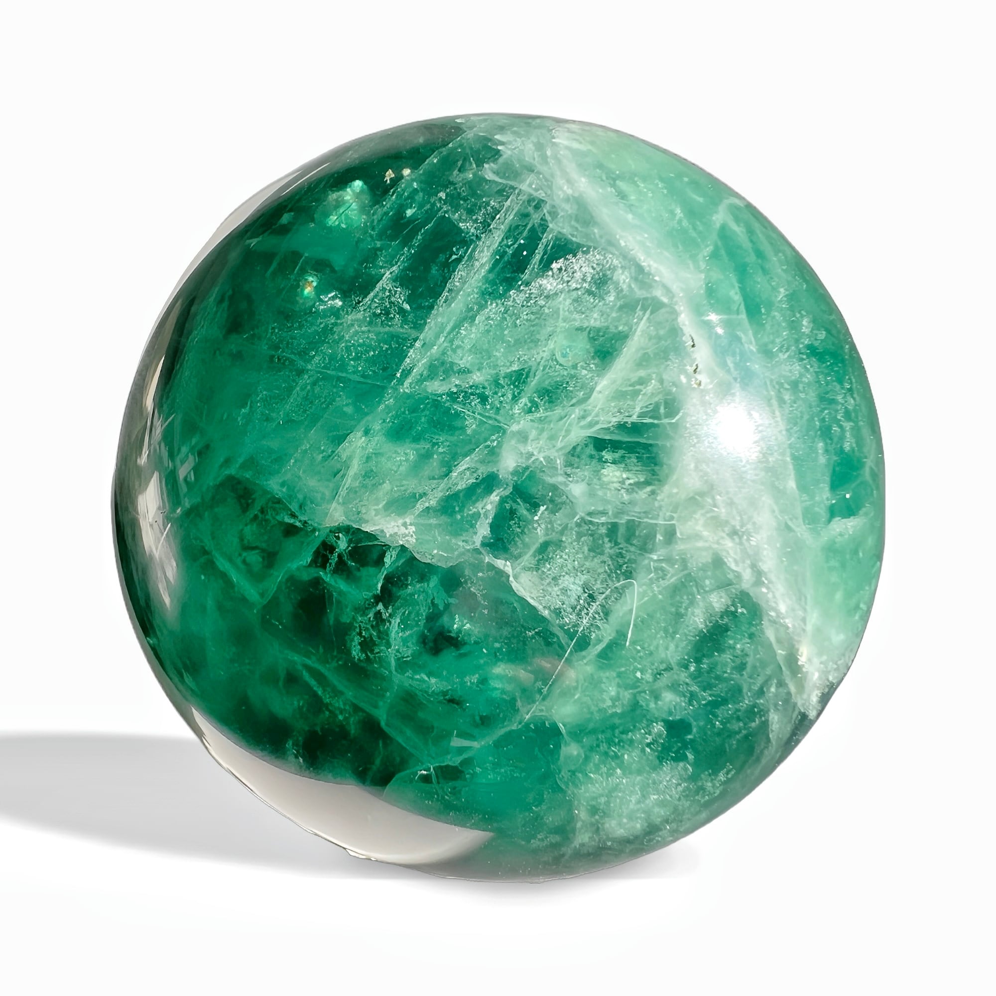 まるで静寂の森が、そのまま結晶化したかのような、湖南省産のエメラルドグリーンのフローライトスフィアです。
