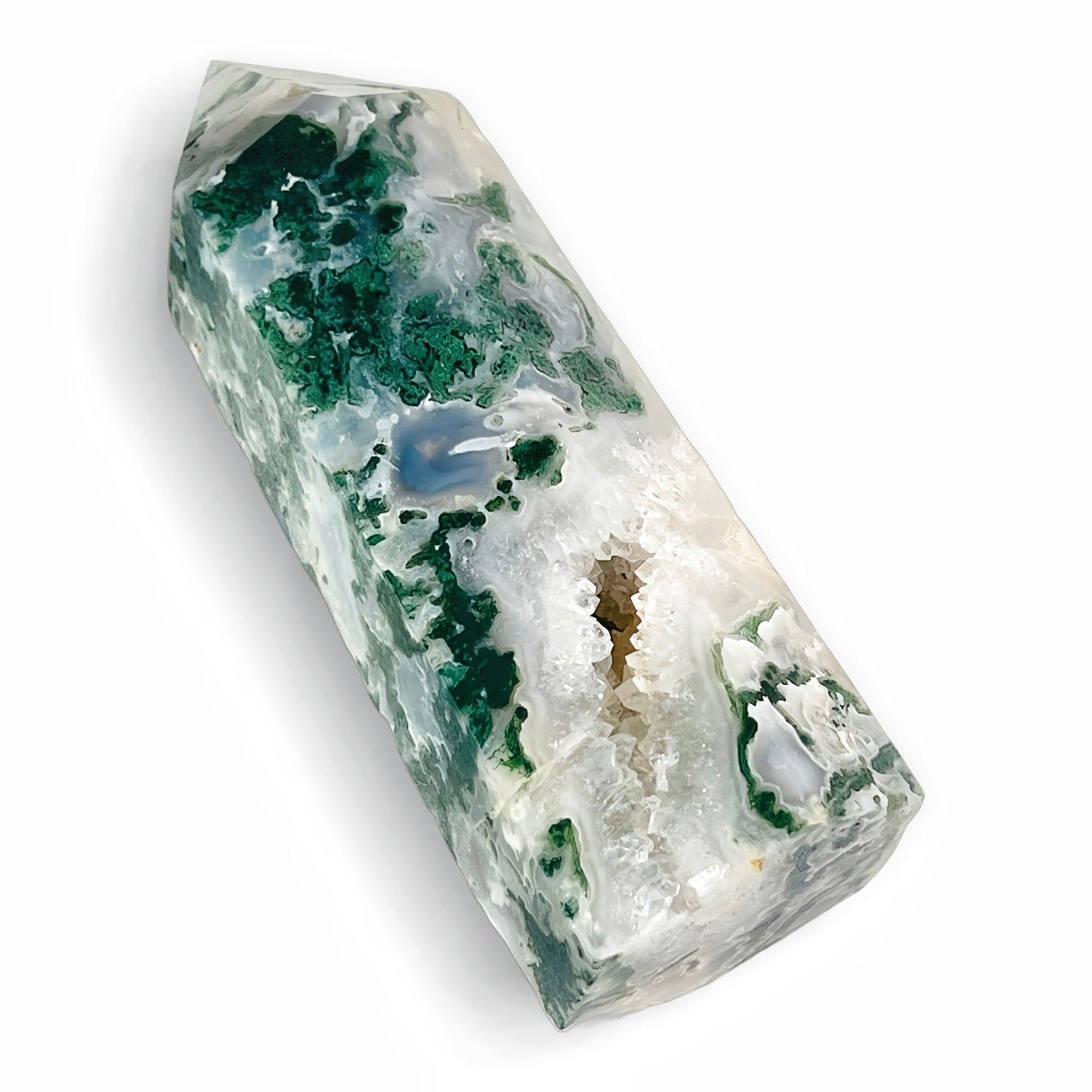 モスアゲートのタワーとしては比較的大きめで、ドゥルージーのきらめきも美しい一本です。